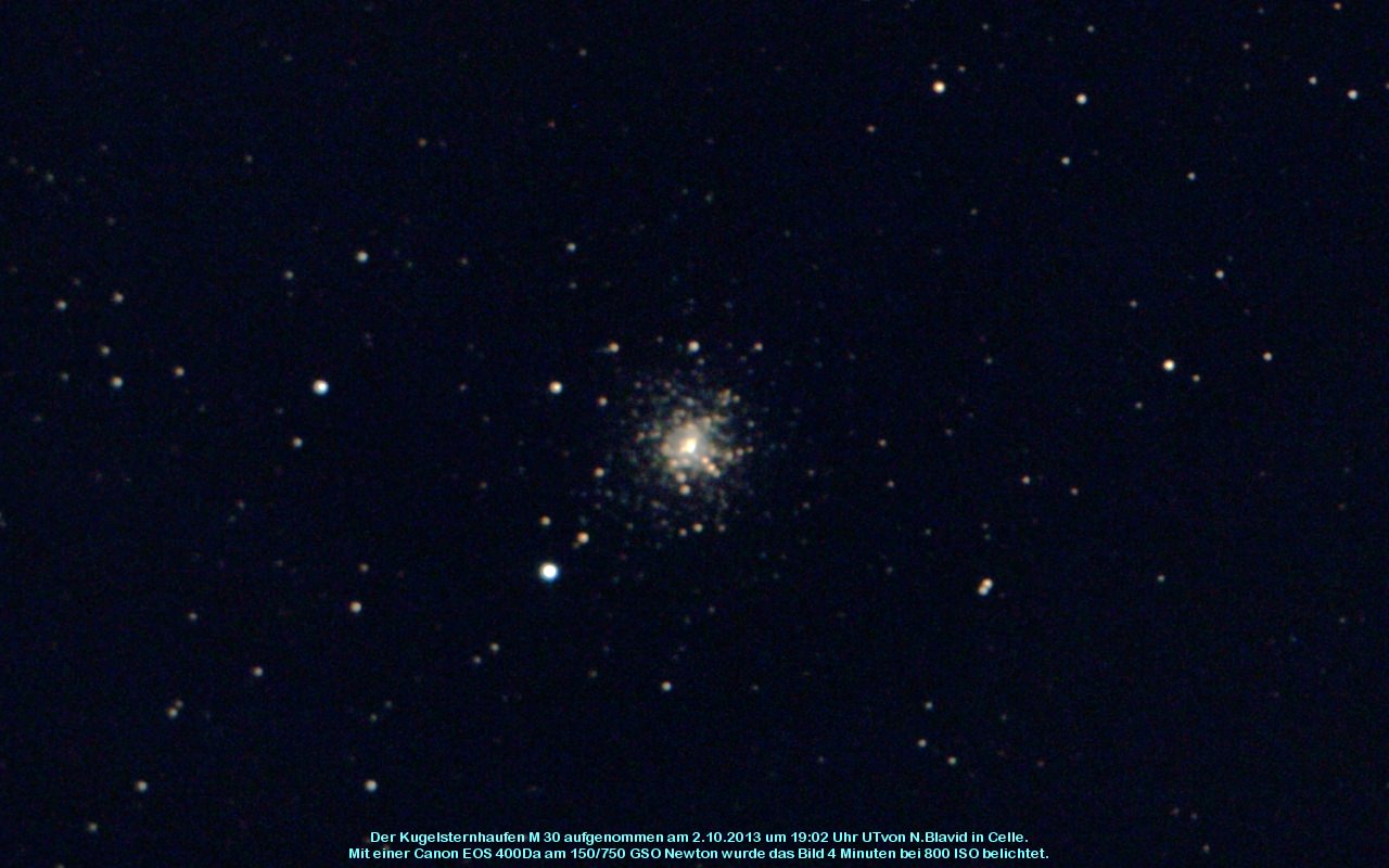 Der Kugelsternhaufen M 30 ist vom Typ V. Er steht sehr horizontnah am Himmel. Entdeckt wurde er 1764 von Messier.