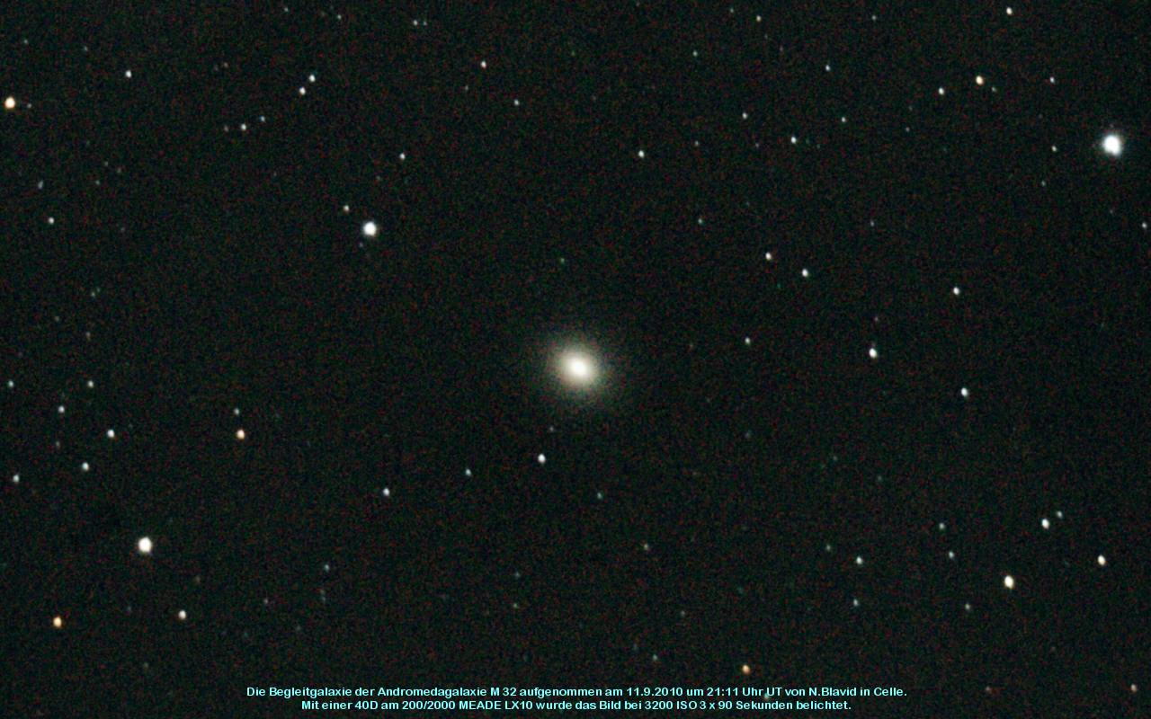 M 32 ist als elliptische Begleitgalaxie der Andromeda ebenfalls ein Mitglied der lokalen Gruppe. Sie ist vom Typ E2. Entdeckt wurde sie am 29. Oktober 1749 von Guillaume Le Gentil.