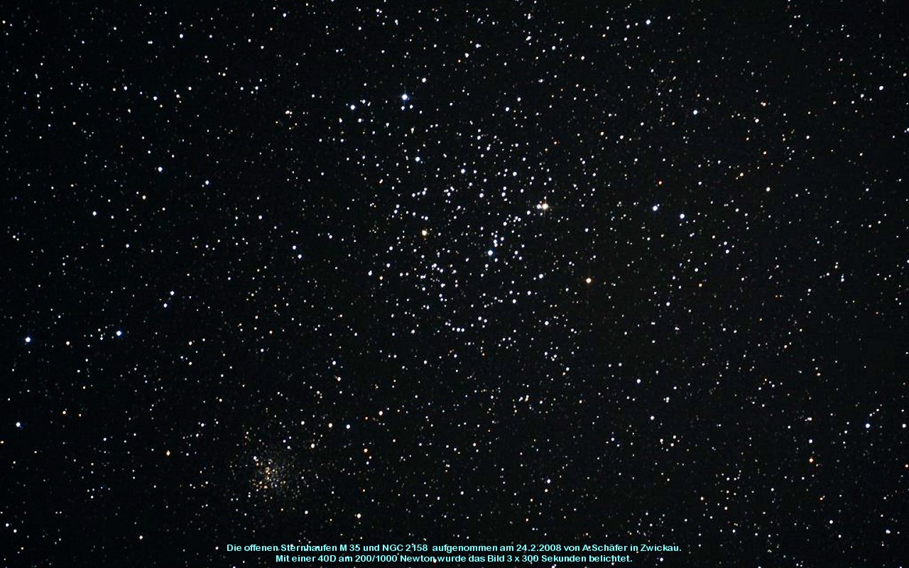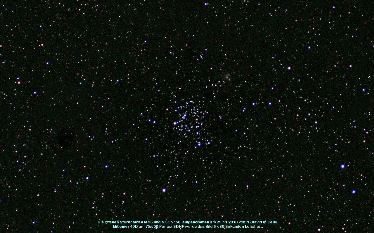 M 35 ist ein offener Sternhaufen mit 153 Sternen. Er ist vom Typ III 3 r, sein Alter wird auf 100 Millionen Jahre geschätzt. Entdeckt wurde er 1745 von de Chéseaux. Der neben M 35 liegende Sternhaufen NGC 2158 ist eigentlich größer als dieser, liegt aber mit 16000 ly auch viel weiter entfernt.