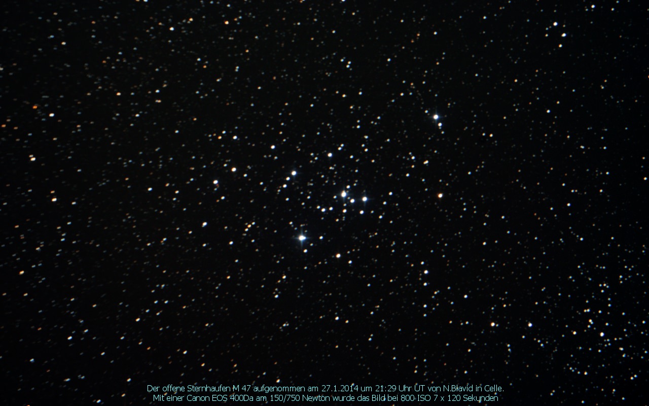 M 47 ist ein offener Sternhaufen mit ca. 50 Sternen. Er ist vom Typ III 2 m, sein Alter wird auf 78 Millionen Jahre geschätzt. Entdeckt wurde er 1654 von Giovanni Battista Hodierna. Unter guten äußeren Bedingungen ist er mit bloßem Auge sichtbar.