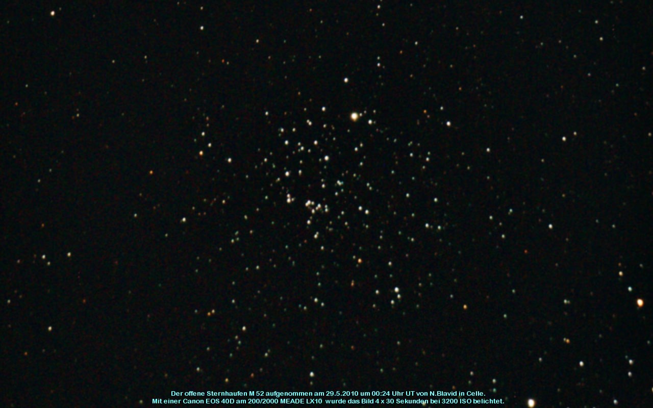 M 52 ist ein offener Sternhaufen mit ca. 200 Sternen. Er ist vom Typ I 2 r, sein Alter wird auf 35 Millionen Jahre geschätzt. Entdeckt wurde er 1774 von Charles Messier. Unter guten äußeren Bedingungen ist er mit bloßem Auge sichtbar, in Mitteleuropa aber eher nicht, da er hier immer horizontnah ist.