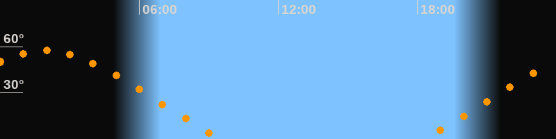 | Aufgang | 18:15 Uhr im Nordosten (αAz = 59,7°) |