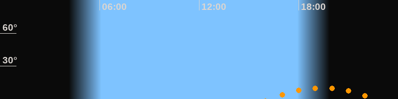 | Untergang | 22:38 Uhr im Südwesten (αAz = 221°) |