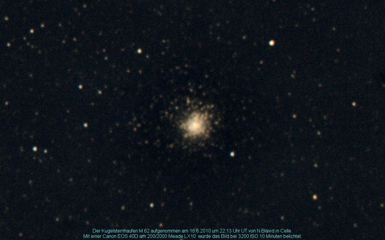 Der Kugelsternhaufen M 62 ist vom Typ IV. Er steht in Mitteleuropa sehr horizontnah am Himmel. Entdeckt wurde er 1771 von Charles Messier.