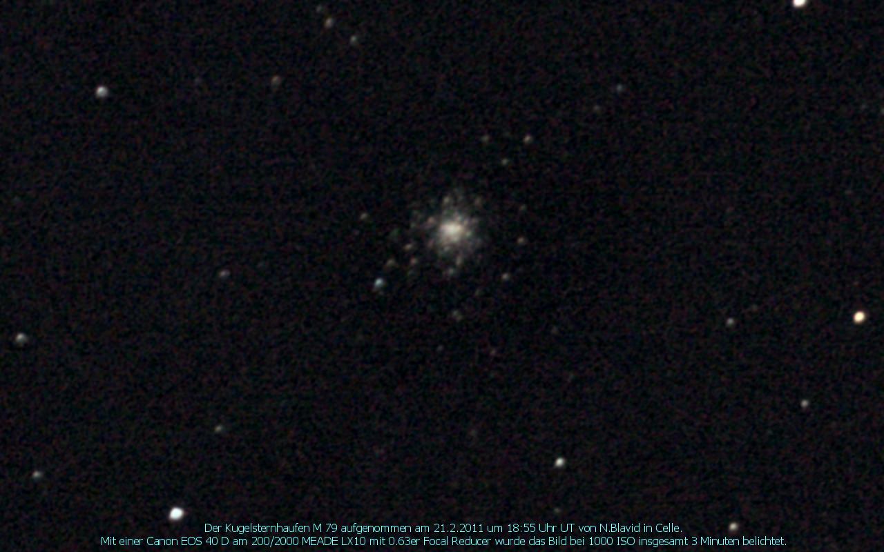 Der Kugelsternhaufen M 79 ist vom Typ V. Entdeckt wurde er 1780 von Pierre Méchain. M 79 gehörte ursprünglich zur Canis Major Zwerggalaxie. Diese hat sich durch die gravitative Wirkung der Milchstraße aber inzwischen fast aufgelöst, so dass M 79 jetzt an die Milchstraße gekoppelt ist.