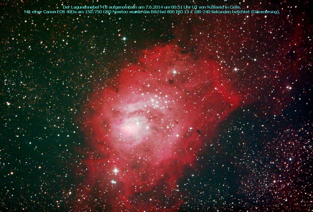 Der Lagunennebel ist der zweithellste von Mitteleuropa beobachtbare Gasnebel. Er enthält den Offenen Sternhaufen NGC 6530. Entdeckt wurde er um 1747 von Guillaume le Gentil. Der offene Sternhaufen wurde schon um 1680 von John Flamsteed entdeckt.
