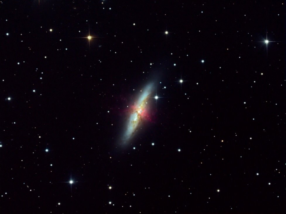 Die Zigarrengalaxie M 82 ist eine wahrscheinlich eine Balkenspiralgalaxie vom Typ SBc. Bis vor Kurzem wurde sie noch als irreguläre Galaxie eingeordnet. Sie gehört zu M81-Gruppe und ist eine sogenannte Starburst-Galaxie. Entdeckt wurde sie am 31.Dezember 1774 von Johann Elert Bode.