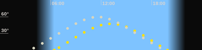 | Sonnenaufgang | 06:25 Uhr im Osten (αAz = 76.2°) |