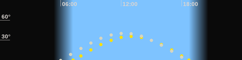 | Sonnenaufgang | 07:13 Uhr im Osten (αAz = 95°) |
