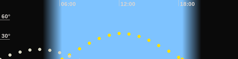 Bei Beginn der Morgendämmerung ist der Übergangshimmel Frühling/Sommer zu sehen. Im Süden stehen die Waage, der Schlangenträger und der nördliche Teil des Skorpions (der südliche ist in Mitteleuropa leider nicht sichtbar). Im Osten steht das Sommerdreieck schon recht hoch und im Südosten geht der Schütze auf.