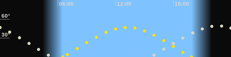 | Sonnenaufgang | 06:30 Uhr im Osten (αAz = 77.4°) |