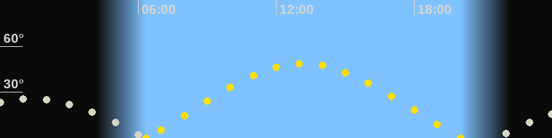 | Sonnenaufgang | 06:20 Uhr im Osten (αAz = 74.4°) |