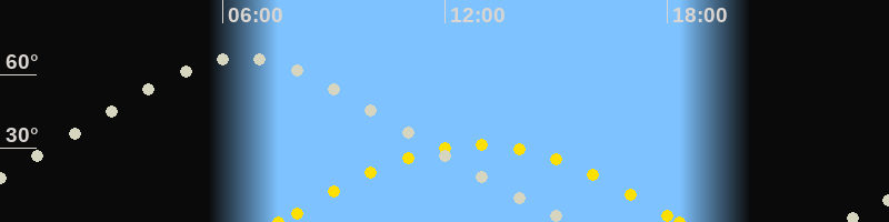 | Sonnenaufgang | 07:30 Uhr im Osten (αAz = 101.6°) |
