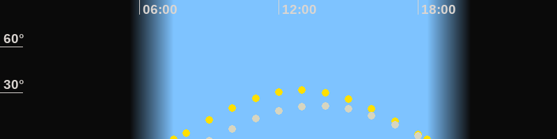 | Sonnenuntergang | 18:23 Uhr im Westen (αAz = 258.9°) |