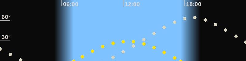 | Sonnenaufgang | 07:10 Uhr im Osten (αAz = 105.6°) |