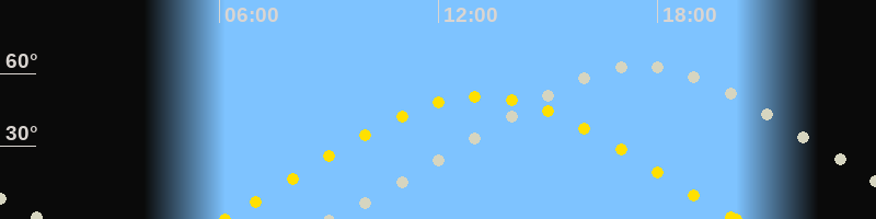 | Sonnenaufgang | 06:09 Uhr im Osten (αAz = 71.5°) |