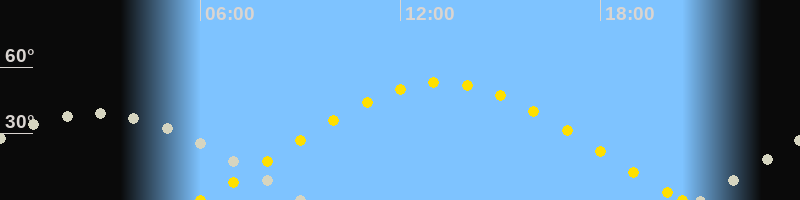 | Sonnenaufgang | 06:00 Uhr im Nordosten (αAz = 67°) |