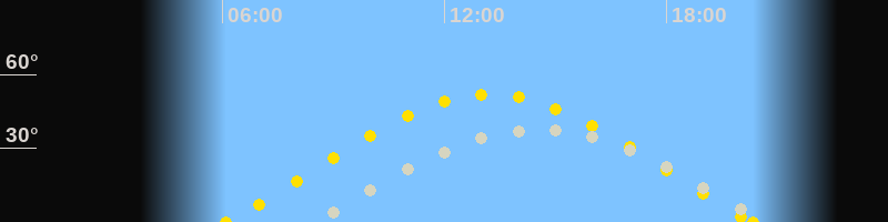 | Sonnenaufgang | 06:06 Uhr im Osten (αAz = 69°) |