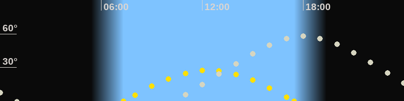 | Sonnenaufgang | 07:20 Uhr im Osten (αAz = 108.3°) |
