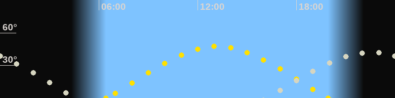 | Sonnenaufgang | 06:26 Uhr im Osten (αAz = 76.1°) |