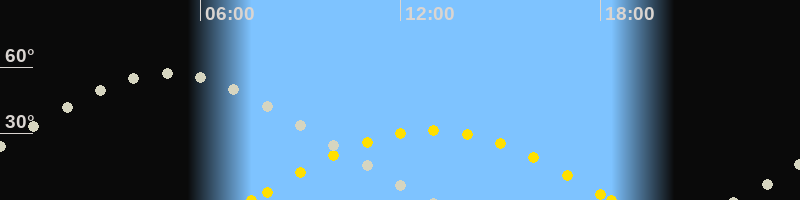 | Sonnenuntergang | 18:20 Uhr im Westen (αAz = 258.1°) |