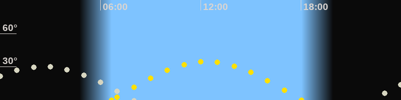 Bei Beginn der Morgendämmerung ist der Übergangshimmel Frühling/Sommer zu sehen. Im Süden stehen die Waage, der Schlangenträger und der nördliche Teil des Skorpions (der südliche ist in Mitteleuropa leider nicht sichtbar). Im Osten steht das Sommerdreieck schon recht hoch und im Südosten geht der Schütze auf.
