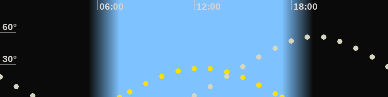 | Sonnenaufgang | 07:23 Uhr im Osten (αAz = 109.3°) |