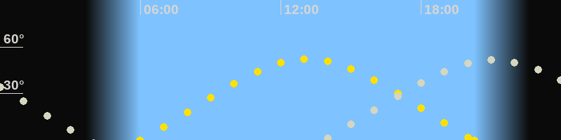 | Sonnenaufgang | 05:59 Uhr im Osten (αAz = 68.7°) |