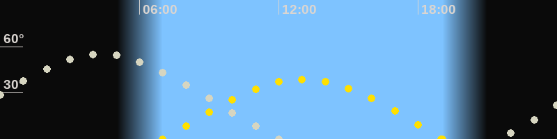 | Sonnenaufgang | 07:00 Uhr im Osten (αAz = 89.8°) |
