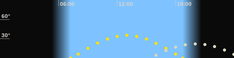 | Sonnenuntergang | 18:43 Uhr im Westen (αAz = 264.6°) |