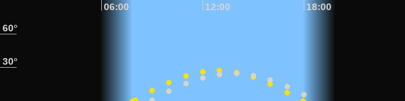| Sonnenaufgang | 07:50 Uhr im Osten (αAz = 108.2°) |