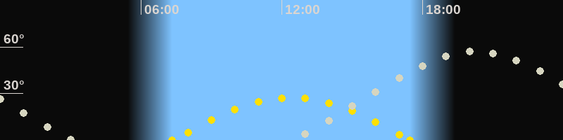 | Sonnenaufgang | 07:20 Uhr im Osten (αAz = 108.5°) |