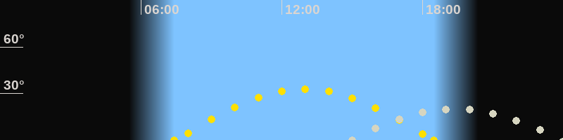 | Sonnenuntergang | 18:29 Uhr im Westen (αAz = 260.6°) |