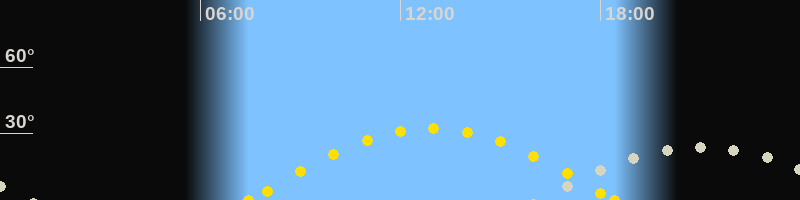 | Sonnenuntergang | 18:25 Uhr im Westen (αAz = 259.4°) |