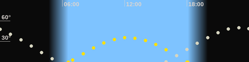 Bei Beginn der Morgendämmerung ist der Übergangshimmel Frühling/Sommer zu sehen. Im Süden stehen die Waage, der Schlangenträger und der nördliche Teil des Skorpions (der südliche ist in Mitteleuropa leider nicht sichtbar). Im Osten steht das Sommerdreieck schon recht hoch und im Südosten geht der Schütze auf.