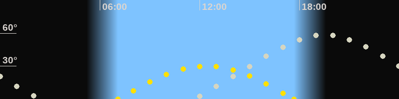 | Höchster Sonnenstand (Kulmination) | 12:23 Uhr (h = 30.1°) |