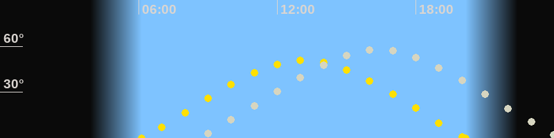 | Sonnenaufgang | 06:08 Uhr im Osten (αAz = 71.3°) |