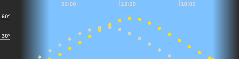| Höchster Sonnenstand (Kulmination) | 13:09 Uhr (h = 62.3°) |