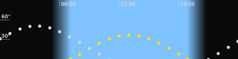 | Sonnenaufgang | 07:07 Uhr im Osten (αAz = 92.7°) |