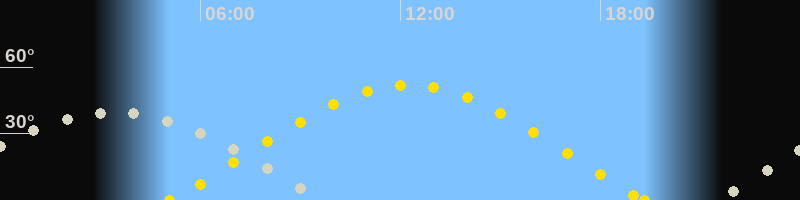 | Sonnenaufgang | 05:05 Uhr im Osten (αAz = 68.9°) |