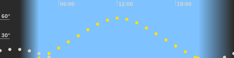 | Höchster Sonnenstand (Kulmination) | 12:09 Uhr (h = 62.1°) |