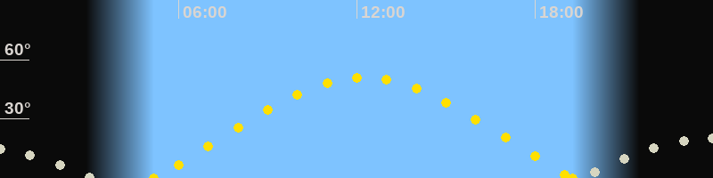 | Sonnenuntergang | 19:15 Uhr im Westen (αAz = 289.4°) |