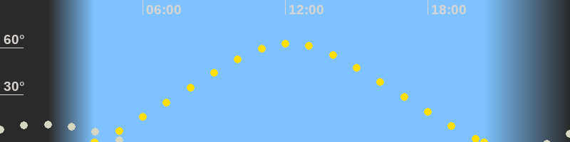 | Höchster Sonnenstand (Kulmination) | 12:11 Uhr (h = 62.6°) |