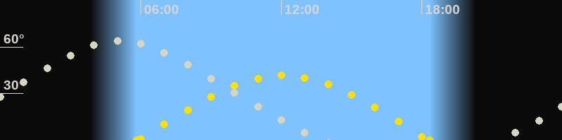 | Sonnenuntergang | 18:19 Uhr im Westen (αAz = 274.3°) |