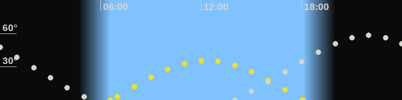 Bei Beginn der Morgendämmerung ist der Übergangshimmel Frühling/Sommer zu sehen. Im Süden stehen die Waage, der Schlangenträger und der nördliche Teil des Skorpions (der südliche ist in Mitteleuropa leider nicht sichtbar). Im Osten steht das Sommerdreieck schon recht hoch und im Südosten geht der Schütze auf.