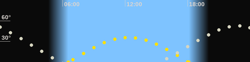 Bei Beginn der Morgendämmerung ist der Übergangshimmel Frühling/Sommer zu sehen. Im Süden stehen die Waage, der Schlangenträger und der nördliche Teil des Skorpions (der südliche ist in Mitteleuropa leider nicht sichtbar). Im Osten steht das Sommerdreieck schon recht hoch und im Südosten geht der Schütze auf.