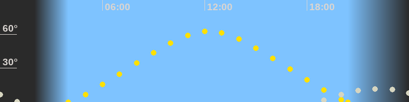 | Höchster Sonnenstand (Kulmination) | 12:13 Uhr (h = 62.6°) |