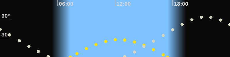 | Sonnenaufgang | 07:19 Uhr im Osten (αAz = 108.3°) |