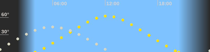 | Höchster Sonnenstand (Kulmination) | 12:13 Uhr (h = 62.6°) |