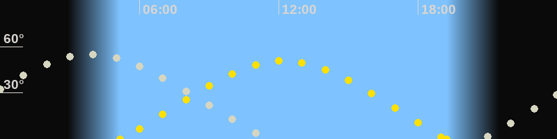 | Sonnenaufgang | 05:10 Uhr im Osten (αAz = 70.5°) |
